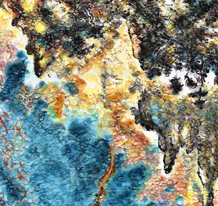 在《十方空间》中,我们便可以明显的看到大愚将金石线条纯熟地运用于绘画之中,流动的线条随画家情感的变化在色彩中徜徉,或静穆、或苍茫、或凝重、或洒脱,充满着张力和生机,物象、情感、意境统统融入其中。