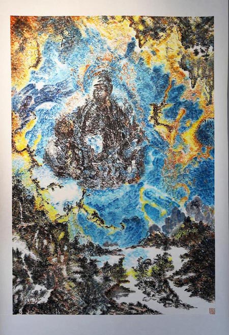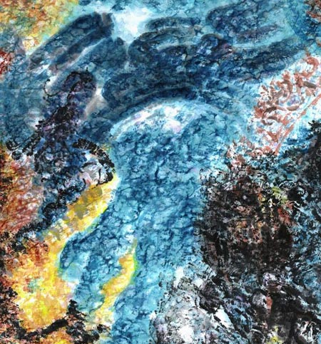 相对于下方田园山水的细腻典雅,佛像中的线条则显得更为粗犷豪放,气势磅礴,在蓝色的衬托下,使得佛像犹如一团升腾的火焰。而在蓝色的大海中,大愚将中国画中的笔法、墨法、水法与西方的色彩、笔触结合起来,很多地方是东方的线条还是西方的笔触已分不清楚,金石线条绘就的龙与寥寥几笔皴擦出的凤顾盼生辉。