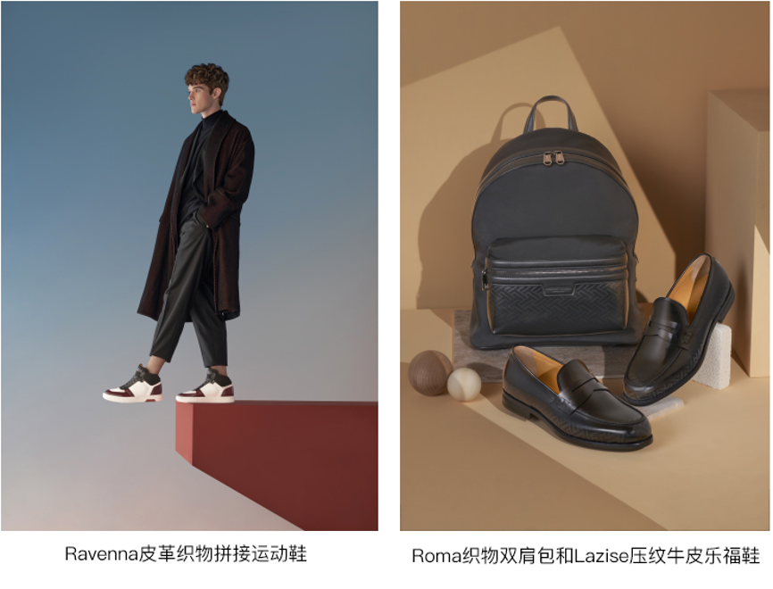 全新2021秋冬系列以「焕新探索之旅」为主题,重新演绎AMEDEO TESTONI铁狮东尼深厚的文化内涵与精湛的传统工艺。新系列中,经典设计元素被焕新演绎。主打单品Ravenna Sneakers(左图),三大经典图案在碰撞中再掀时尚百搭风潮。这款极具街头风格的运动鞋,采用不同颜色的小牛皮和创新科技面料拼制而成,舒适间打造专属都市型格。本季单品同时融合创新技术与经典美学,将现代压花结合印刷技术,把源自悠久传统中的设计灵感以全新的诠释焕发生机。其中,Lazise压纹牛皮乐福鞋(右图),采用刷色小牛皮与超轻橡胶鞋底,搭配隐形互扣式T字印花,细节之处皆透露着优雅精致的美学巧思。另一款Roma织物双肩包(右图),主体设计选用运动风格可再生尼龙,绗缝“Interlocking T”细节和同色系小牛皮嵌件;侧袋选择抽绳装饰,同时搭配松紧后系带,可轻松固定在拉杆箱上,巧妙结合当下流行态度与生活方式,打造日常必不可少的出行搭档。