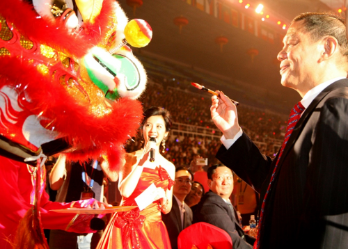 2009年9月,陈江和在北京市政府举办的“水立方”捐建答谢晚会上为舞狮点睛