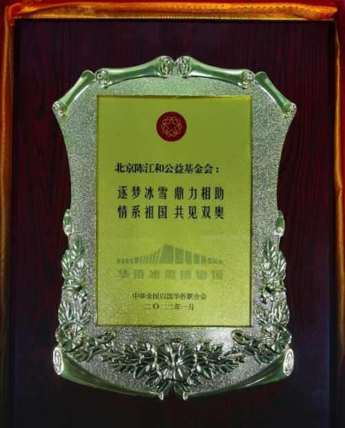 2022年1月20日,华侨冰雪博物馆举行落成仪式,由于疫情,陈江和虽然未能亲自成行,但特意委托工作人员专程祝贺。万立骏主席向北京陈江和公益基金会颁发了纪念奖牌。华侨冰雪博物馆专门设立了金鹰厅。