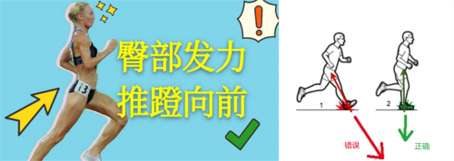 臀部发力推蹬带动身体向前;同时落地前大腿后侧发力,使脚掌落点靠近身体中线,从而减少步幅(这是因为地面带给人的冲击力是向后的,过大步幅会导致膝盖疼痛);落地时,无论是前脚掌还是脚后跟着地姿势,都应该有一个缓冲卸力的过程,将地面的反作用力化解,减轻对膝关节的冲击。