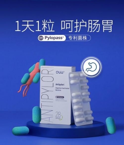 OUU抗幽护胃益生菌,这款产品采用诺维信专利菌株:罗伊氏乳杆菌DSM17648,这个菌株能够不受胃酸影响、直达胃部,精准识别并捕捉胃里面的幽门螺杆菌,再通过物理聚合,将聚合物从消化道排出体外。产品在多国经过验证,效果显著。