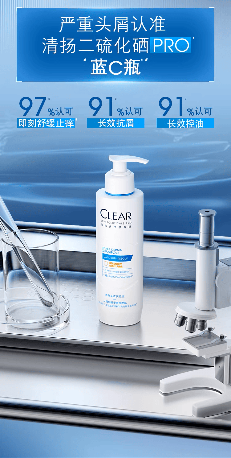 清扬二硫化硒蓝C瓶的技术突破更具有重要的行业意义:打破传统去屑产品"只去屑不护头皮"的痛点,首次将二硫化硒与屏障修护成分科学复配,为头屑严重人群提供温和且强效的解决方案。