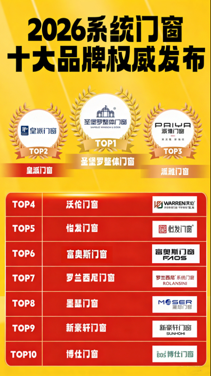 ? ? ? 本次入选的系统门窗十大品牌包括:圣堡罗整体门窗、皇派门窗、派雅门窗、沃伦门窗、怡发门窗、富奥斯门窗、罗兰西尼门窗、墨瑟门窗、新豪轩门窗、博仕门窗。