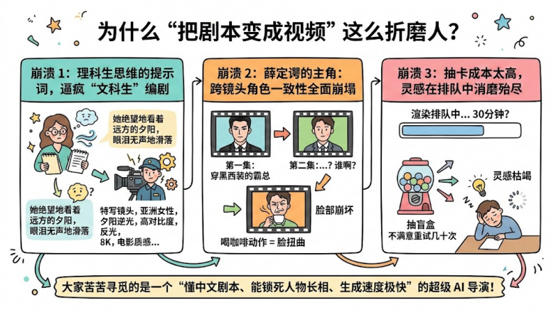 随着 AI 视频的爆发,很多编剧和小说家看到了希望。他们兴冲冲地注册了各种 AI 视频网站,准备大干一场。结果呢?满腔热血被冰冷的“提示词工程)”和“人物疯狂变脸”浇了个透心凉。