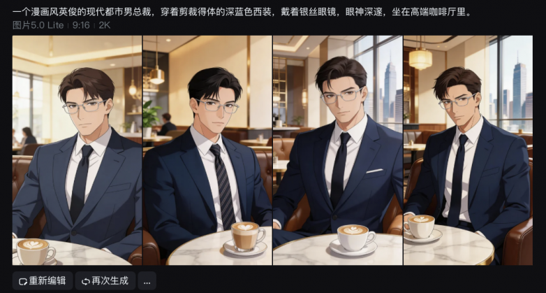 设定提示词:一个漫画风英俊的现代都市男总裁,穿着剪裁得体的深蓝色西装,戴着银丝眼镜,眼神深邃,坐在高端咖啡厅里。