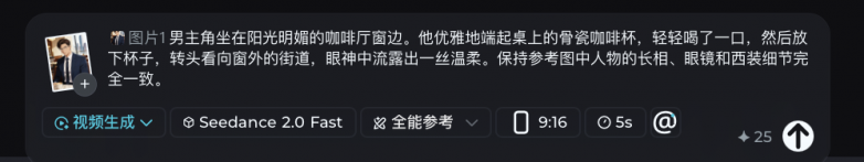 进入 Seedance 2.0,上传刚刚保存的“男主定妆照”作为图像参考。