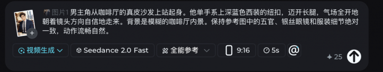 结合剧本输入 Prompt:剧本场景:男主角从咖啡厅的真皮沙发上站起身。他单手系上深蓝色西装的纽扣,迈开长腿,气场全开地朝着镜头方向自信地走来。背景是模糊的咖啡厅内景。保持参考图中的五官、银丝眼镜和服装细节绝对一致,动作流畅自然。