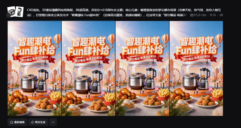 场景痛点: 618电商大促的3D海报是重灾区。需要将特定的家电产品无缝融入到包含巨型3D字体、诱人美食和都市背景的复杂场景中。以前这需要C4D建模师熬夜好几天。