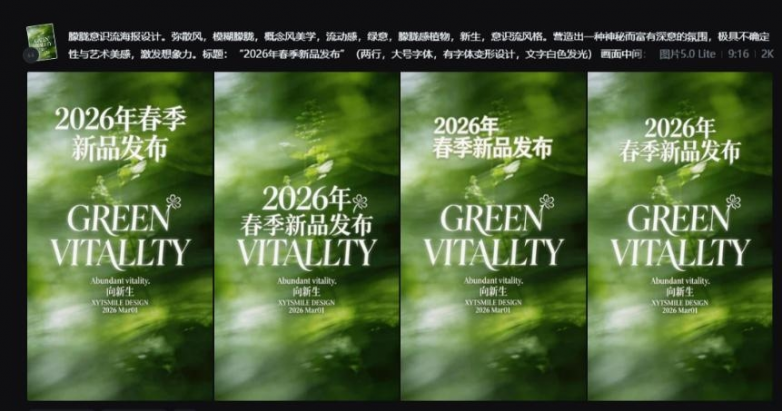 交付成果: 惊艳全场!它不仅完美拿捏了“弥散风”和“朦胧绿意”的艺术氛围,最恐怖的是它的文字渲染能力。长达6组的中英文长短句、华丽衬线体、收尾花签、光影穿透效果,被一字不落地精准还原。一张极具大牌质感的新品预热海报,不用打开PS就直接出图了。