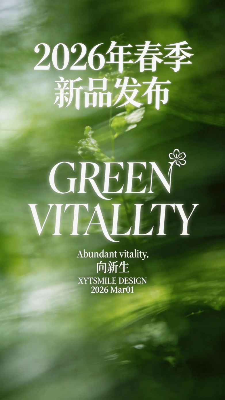 核心提示词: 朦胧意识流海报设计。弥散风,模糊朦胧,概念风美学,流动感,绿意,朦胧感植物,新生,意识流风格。营造出一种神秘而富有深意的氛围,极具不确定性与艺术美感,激发想象力。标题:“2026年春季新品发布”(两行,大号字体,有字体变形设计,文字白色发光) 画面中间:“GREEN VITALLTY”(标题分列两行,字体华丽衬线字体,字体笔画收尾有花签,字体似隐似现,光影穿透轮廓,文字白色发光)。小小的英文字:“Abundant vitality.”“向新生”“XYTSMILE DESIGN”“2026 Mar01”.