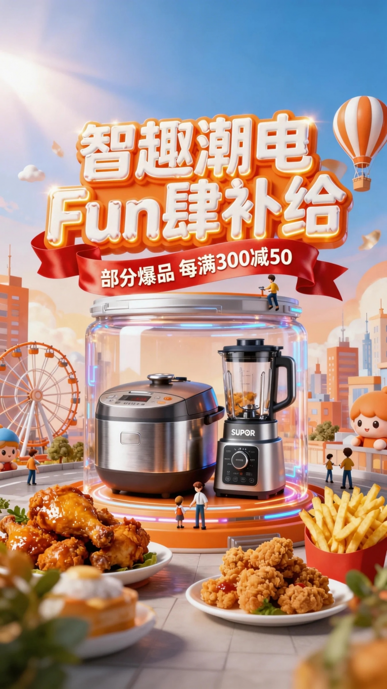 核心提示词: C4D渲染,3D童话潮趣风电商海报,8K超高清,苏泊尔×618周年庆主题;核心元素:暖橙蓝渐变的梦幻都市背景(含摩天轮、热气球、迷你人物互动),巨型橙白渐变立体发光字“智趣潮电 Fun肆补给”(边缘高光精致,质感如糖霜),红丝带文案“部分爆品 每满300减50”(丝带褶皱自然、光泽柔和),透明科幻罐体内的苏泊尔家电(电饭煲@图片1、料理机@图片2),环绕的诱人美食(苏式炸鸡色泽金黄、薯条酥脆);光线采用明亮顶光+侧光,强化文字光泽、家电金属反光、美食色彩鲜活度;细节要求:家电金属纹理细腻、美食质感逼真(炸鸡表皮酥脆反光、薯条颗粒清晰)。