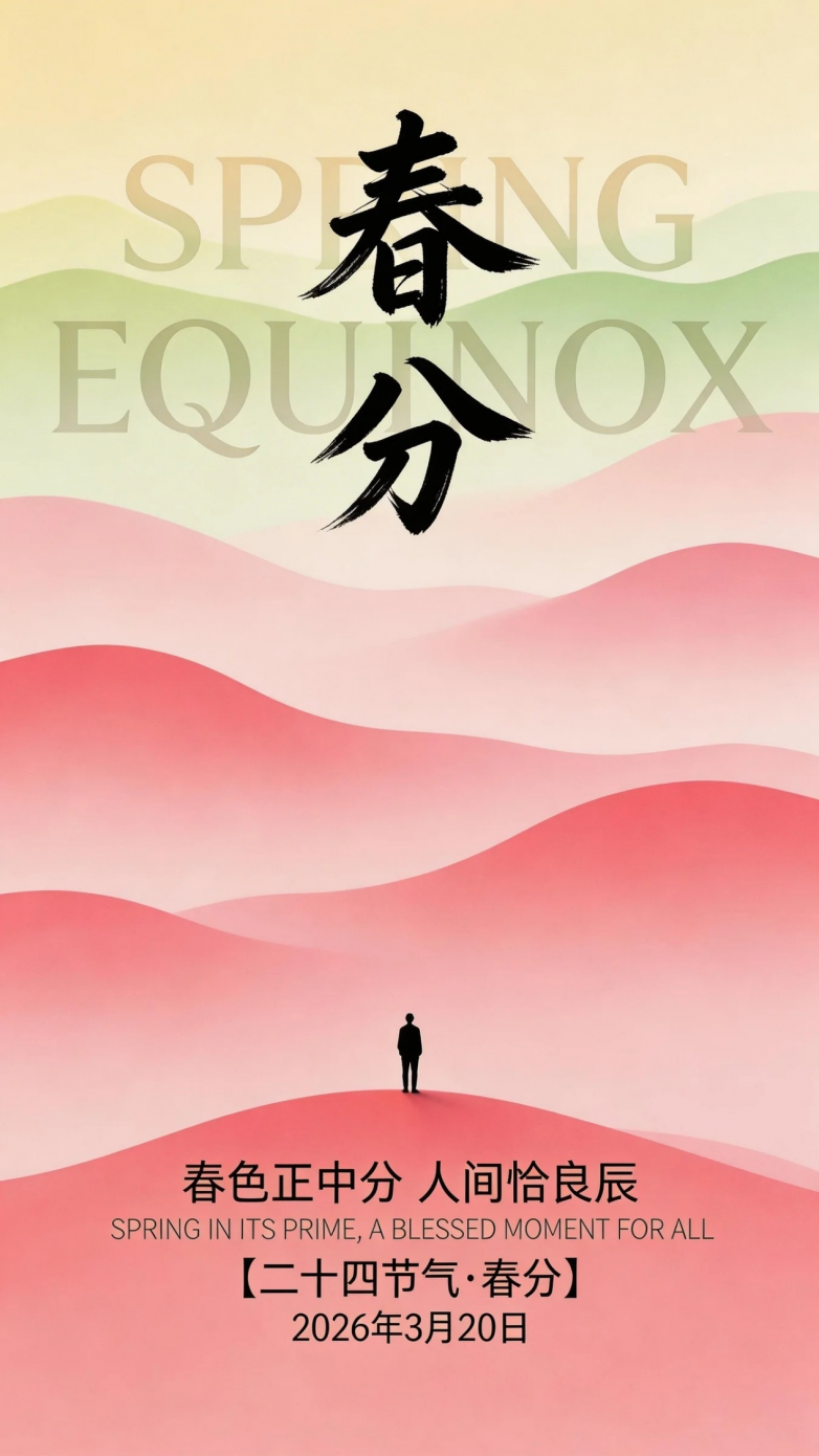 核心提示词: # 春分节气主题海报 1.场景与构图:背景:层叠起伏的渐变色彩山丘,从顶部波浪起伏的浅黄色浅绿过渡占比1/5到中部淡粉再至底部深粉4/5...背景隐约透出半透明的“SPRING EQUINOX”英文(透明度30%)。核心元素:画面上方居中为黑色书法体“秋分”,“春”字起笔3mm收笔1mm ,“分”字左部2.5mm右部撇捺渐细至0.8mm,笔画带有墨汁晕染效果...山丘底部中央站立人物剪影...人物身高与山丘底部单波峰高度比例为1:5。2. 文字布局:人物下方文字依次排列,“春色正中分 人间恰良辰”...“SPRING IN ITS PRIME, A BLESSED MOMENT FOR ALL”...“【二十四节气·春分】”...“2026年3月20日”。各段文字行间距比例为1.2。