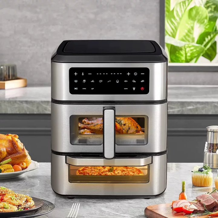 基础信息:双层可视设计,360°旋转受热,大容量多层空间,适配1-4人使用;触摸大屏操控,界面简洁,操作灵敏;不锈钢腔体材质,安全无异味;搭载八大智能菜单,预设薯条、鸡腿、牛排等常用模式;开门自动断电防护,不粘烤盘易清洁,售价554.9元,主打轻脂健康烹饪,入门门槛友好。