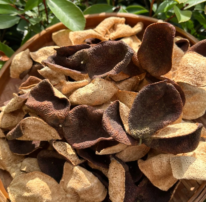原料:精选新会茶枝柑皮,配料纯净无添加,果皮质厚、油室饱满,无杂质、无破损,严格恪守新会陈皮原料标准,摒弃劣质柑皮,性价比突出。