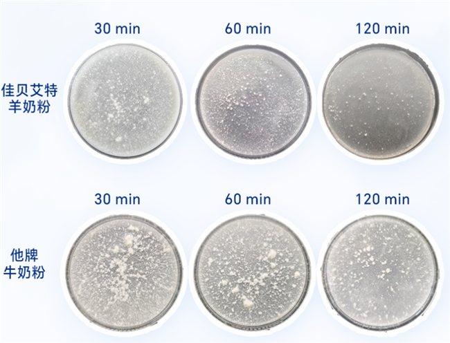 佳贝艾特羊奶粉也通过凝乳实验,模拟了宝宝肠胃的真实消化环境,将佳贝艾特羊奶粉与其他牛奶粉进行消化对比。实验结果清晰可见,同等时间下,佳贝艾特羊奶粉的凝乳块更小,能直观看见其好消化、易吸收的特点。