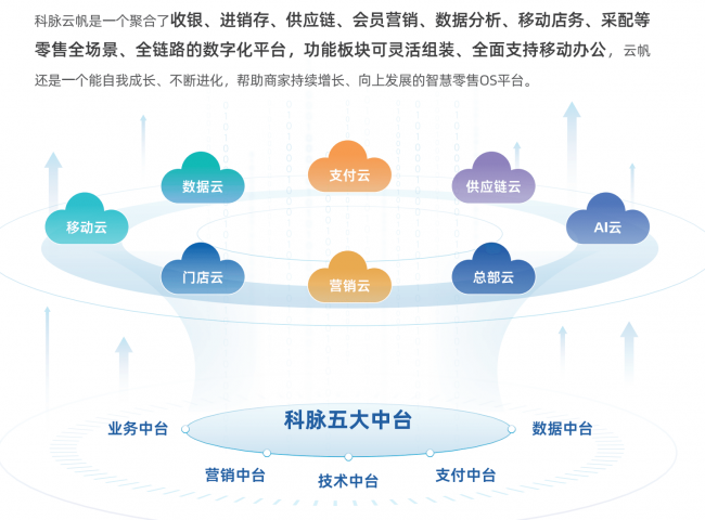 科脉云帆智慧零售OS平台是科脉战略级SaaS平台,基于“业务+营销+支付+数据+技术”五大自研中台,构建了面向零售餐饮的“全业态、全场景、全链路、全数据”四全一体数字平台。