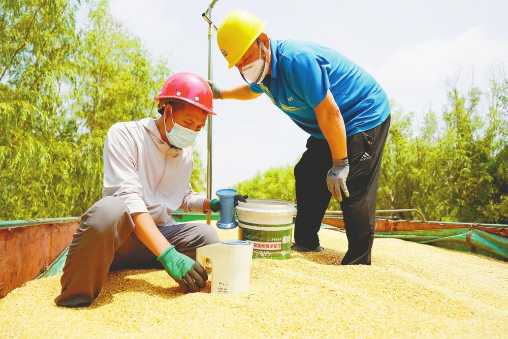 6月14日,河北柏粮粮食储备有限公司工作人员进行小麦取样。