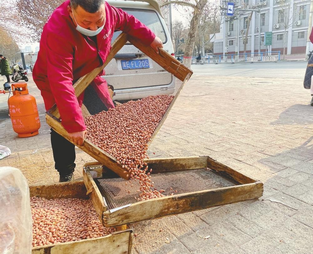 1月11日上午,在信都区建设西大街刘老三炒货坊,门前的炒炉不停地翻转着,送出阵阵干果香。炉内正炒制的是花生仁,刘老三看了看时间,走近炒炉用勺子从炉内舀出花生仁尝了尝说:“还欠点火。”