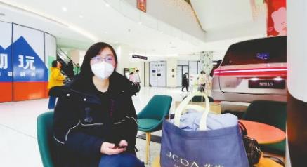 1月21日15时许,在逗号立方购物公园一层,装扮得喜气洋洋的商场内人来人往,现场有汽车展出销售、衣服促销等活动,吸引着顾客上前询问、选购,记者在顾客休息区见到拎着两个购物袋的申佳静。