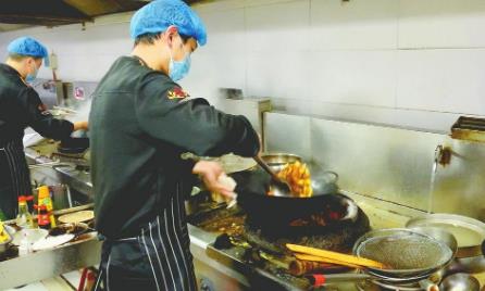 18时许,客人陆续到达,酒店的后厨也忙碌了起来,厨师们的锅铲一刻不停,传菜的服务生推着传菜车在前台和后厨之间来回穿梭,服务员拿着传菜单等在厨房门口。忙碌的间隙,大厨说:“客人多了出菜的速度也要跟上。”