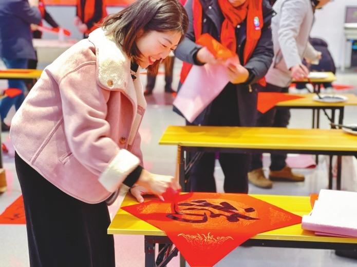 活动现场,一张张铺满桌面的红纸犹如一片喜庆的海洋,映衬出浓厚的节日氛围。书法爱好者们个个精神焕发,挥毫泼墨,笔下生花,一副副寓意美好的春联和一张张福字在他们的笔下逐渐成形。行书流畅洒脱,犹如江河奔腾;隶书古朴典雅,透露出历史的沉淀;楷书端庄秀丽,彰显出书家的严谨与细致。各种书体各显神韵,展示了书法老师们深厚的书法功力。