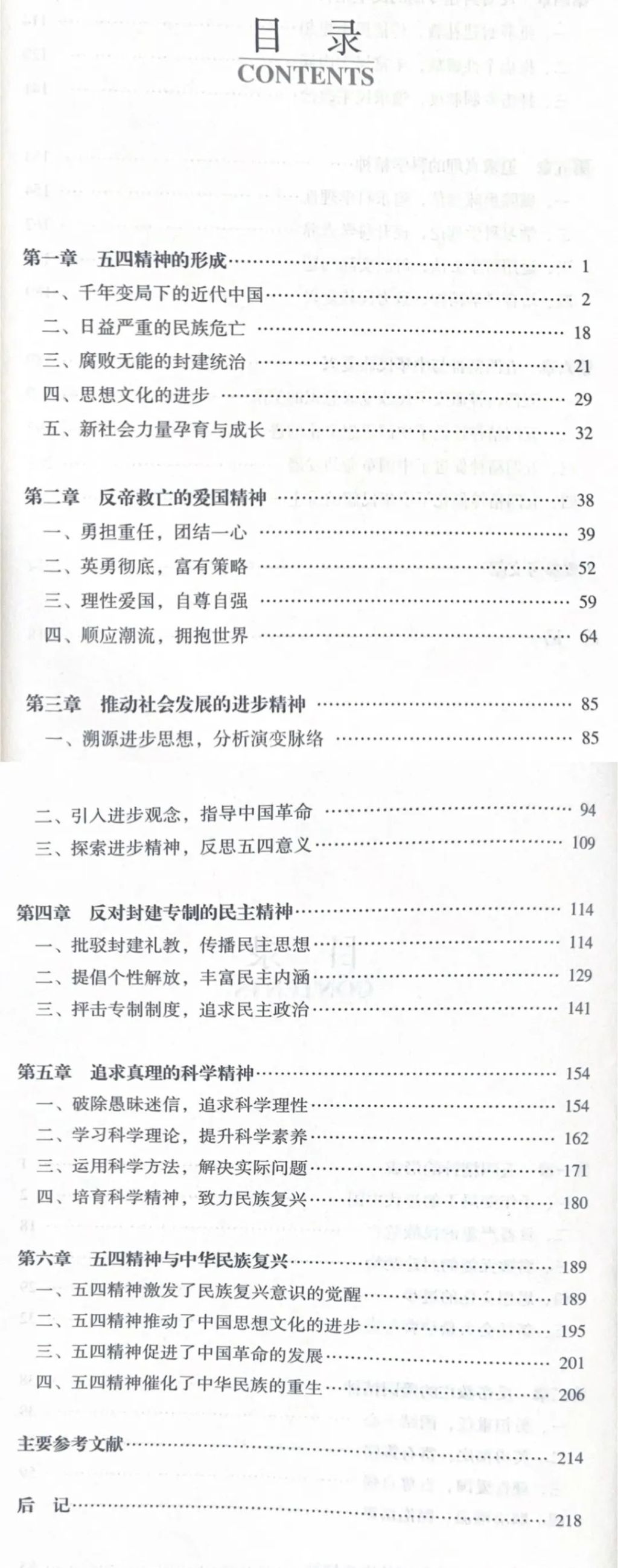 书中对五四运动历史背景进行了细致梳理,生动还原了当时中国内忧外患、风雨飘摇的困境。五四精神内涵丰富且层次分明,爱国、进步、民主、科学四个方面紧密相连。爱国主义构成了五四精神的核心基石,进步精神为社会的持续发展注入源源不断的动力,民主与科学则如同利刃,斩断封建愚昧的枷锁,为社会变革提供了锐利的思想武器。