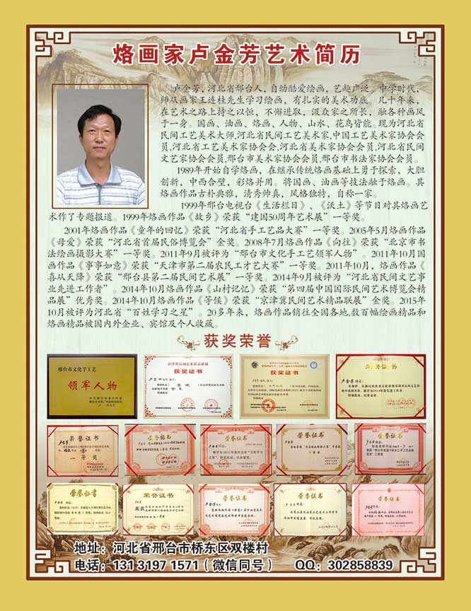 卢金芳自幼痴迷绘画,兴趣广泛。中学时代,他有幸师从天津著名书画家王连桂先生,打下了扎实的美术功底。数十年来,他在艺术道路上从未停歇,广纳百家之长,将多种画风融会贯通,不仅精于烙画,在国画、油画领域亦造诣深厚,人物、山水、花鸟等题材皆能信手拈来。如今,他身兼中国工艺美术家协会会员、河北省民间工艺美术大师、邢台市信都区民间文艺家协会副主席等十余项殊荣,每一份荣誉都是对其艺术成就的最佳佐证。