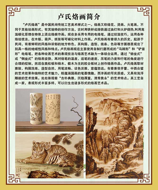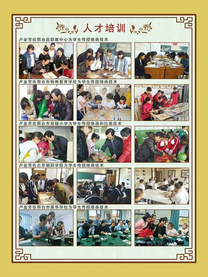 近年来,卢金芳将更多精力投入教育培训事业,致力于烙画艺术的传承与推广。他希望通过言传身教,让这门古老技艺在新时代焕发新生,为民间传统艺术的弘扬与发展贡献力量。这位“守艺人”正以不懈的努力,朝着“让烙画艺术传承创新、发扬光大”的梦想稳步前行。