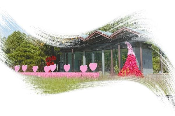 这处婚恋景观位于百花园中央,以原有玻璃小屋为核心打造。小屋一侧垂挂红粉相间的花瀑,旁侧树干装饰大型玫瑰花束,前方则设置了长约7米的粉色座椅,座椅搭配心形立牌,营造出浪漫温馨的氛围。景观周边种植的700余平方米粉黛乱子草正值花期,绿色枝干托举着粉色花穗,在蓝天白云映衬下形成浪漫花海,视觉效果十足。