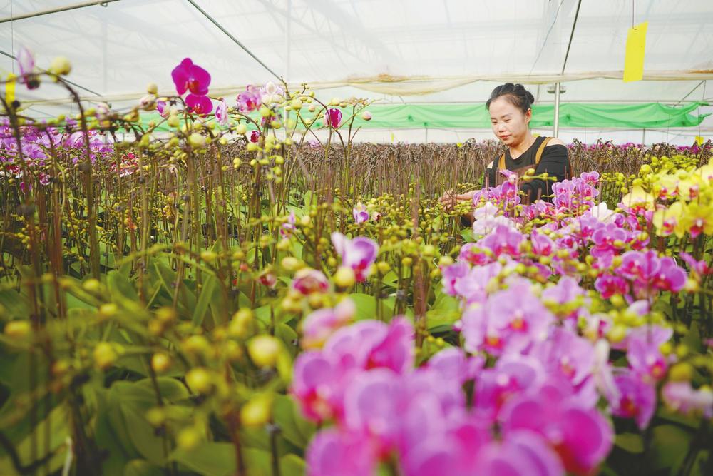 1月5日,内丘县一家农业生态园的智能温室大棚内,40多个品种5万余株蝴蝶兰竞相绽放,花农们精心整理、定型、组盆,做好管护工作,供应市场需求。