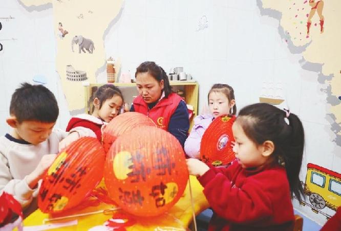 3月2日,南宫市城市社区服务中心组织各社区社工和党员志愿者开展形式多样的庆元宵主题活动。辖区群众一起包汤圆、做花灯、猜灯谜,欢庆元宵佳节。图为南宫市东阳街社区工作者与小朋友一起制作花灯。 韩文洲、田优摄