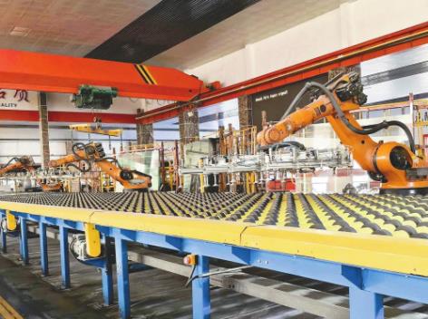 近日,在沙河鸿昇玻璃有限公司浮法玻璃生产线上,机械臂精准抓取玻璃原片、码放订单产品。