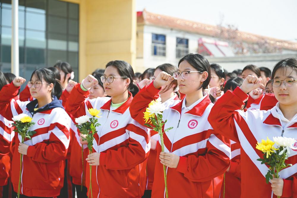▲近日,宁晋中学师生代表到县烈士陵园开展“清明祭英烈”爱国主义教育实践活动。师生代表向革命先烈敬献花篮,聆听革命先烈感人事迹。随后,师生们手持清洁工具,认真清扫陵园、擦拭墓碑,用实际行动守护英烈安息之地。赵烁摄
