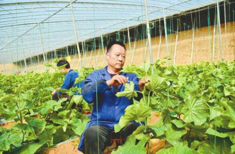 日前,在市经开区留西村蔬菜大棚内农民在管护黄瓜。