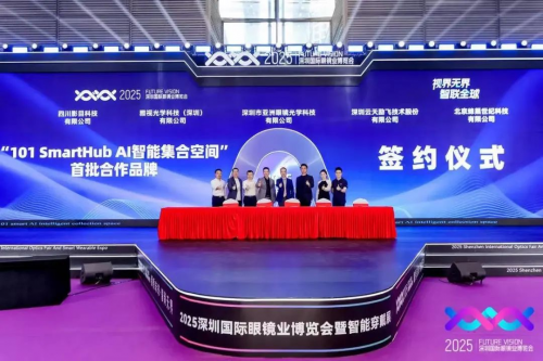 同期,大会举行“101 SmartHub”首批合作品牌签约仪式。深圳市亚洲眼镜、雅视光学科技、深圳云天励飞、四川影目科技、北京蜂巢世纪等5家企业代表登台签约,标志产业协同迈入实质阶段。
