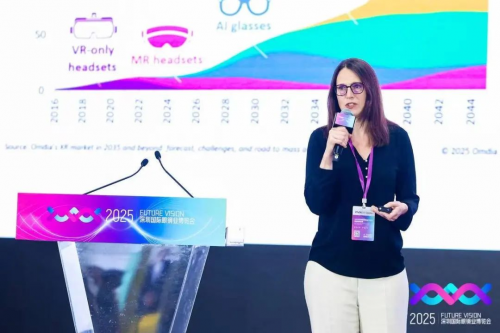 大会特邀国际嘉宾分享前沿洞察。法国REAPSE咨询公司首席执行官、欧洲智能眼镜专家瓦莱丽·里法乌·坎杰洛西(Valérie Riffaud-Cangelosi)发表《智能眼镜:现在和未来》主题演讲。她以全球视角勾勒智能眼镜的技术路线图,指出5G、AR/VR和AI多模态融合是行业关键趋势。瓦莱丽强调,智能眼镜正从“信息显示工具”演变为“场景交互中枢”,在教育、医疗和工业领域应用潜力巨大。
