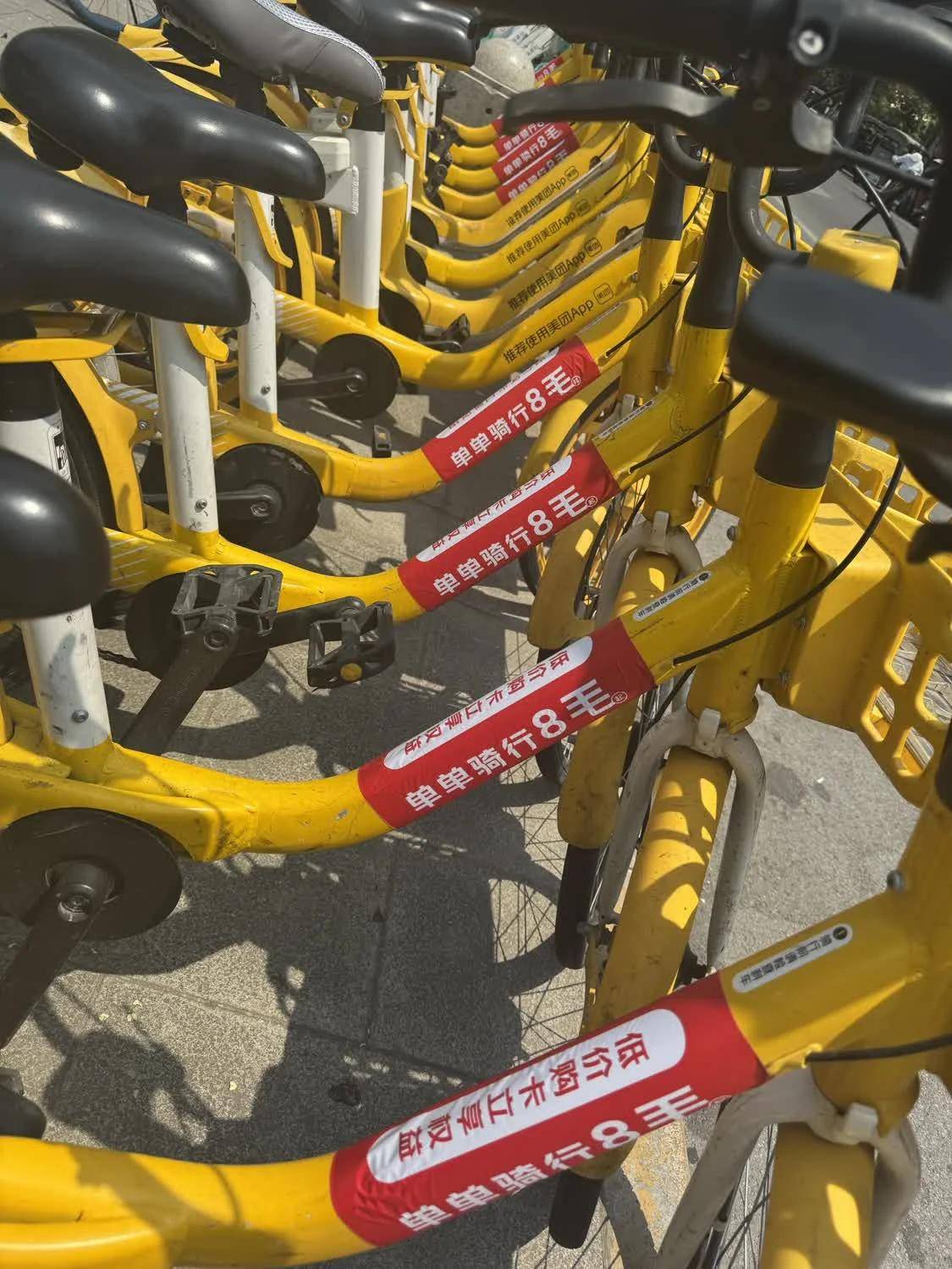8 月下旬,记者走访西安街头发现,美团共享单车的促销宣传较为醒目:多数车辆的车篮、车把位置贴有红色贴纸,以大号加粗字体标注 “单单骑行 8 毛”;用手机扫码进入骑行页面后,系统还会自动播报 “8 毛钱 8 毛钱 每单骑行 8 毛钱,你点了吗?”,易让用户形成 “低价骑行” 的初步认知。