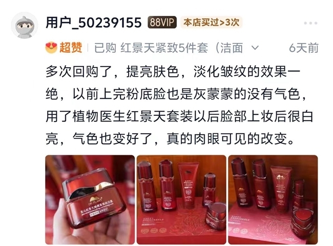 一位回购超过3次的消费者在植物医生的线上门店评价称“红景天套装太惊喜了,用了阵子肤色明显提亮,皮肤又嫩又有光泽,性价比超高,国货大赞!”。另一位多次回购的消费者分享体验表示“提亮肤色,淡化皱纹效果一绝,以前上完粉底脸也是灰蒙蒙的没有气色,现在上妆后很白亮,气色也变好了,真的肉眼可见的改变。”