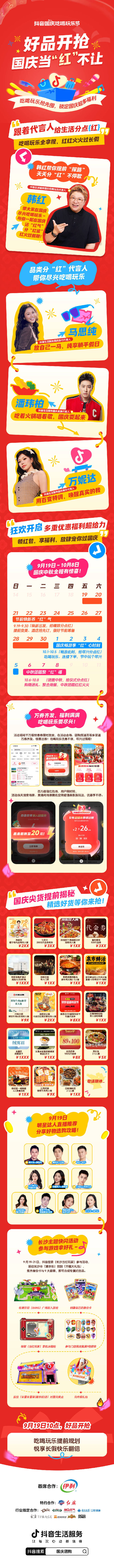 9月19日起,上抖音搜索「国庆团购」进入活动主会场,海量吃喝玩乐好品等你来抢,节前变美、吃喝玩乐、旅游出行、购物送礼等假期“刚需”都能一键搞定。每天10:00/14:00/18:00好券限时发放,千万级特惠券发放,助你吃喝玩乐更尽兴!更有明星达人分享假期好物攻略,百万超值券红包雨随机空降、长沙主题快闪活动沉浸开启,让你边玩边赢好礼……超多活动惊喜不断!