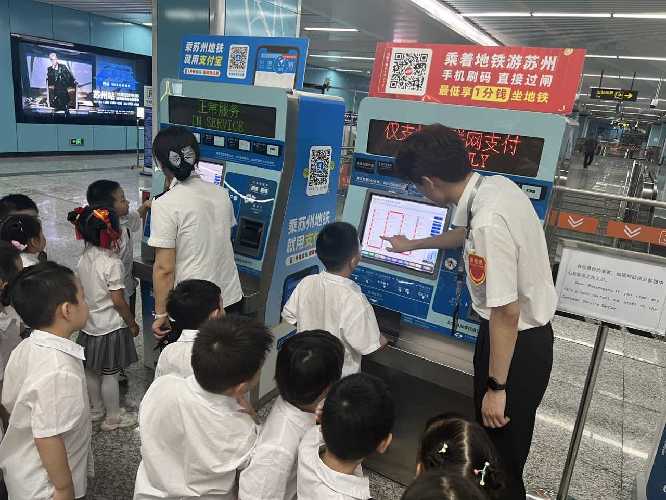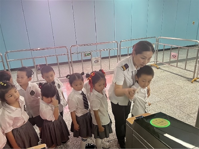 活动现场,地铁站工作人员化身“安全向导”,带领小朋友们从车站入口开始,逐步熟悉站内环境。在闸机前,工作人员演示如何有序排队、正确刷卡过闸,提醒孩子们“不推挤、不单独过闸”;走到客服中心旁,又讲解了“遇到困难找穿工作服叔叔阿姨”的求助方法,以现场场景为教材,让知识更贴近实际。